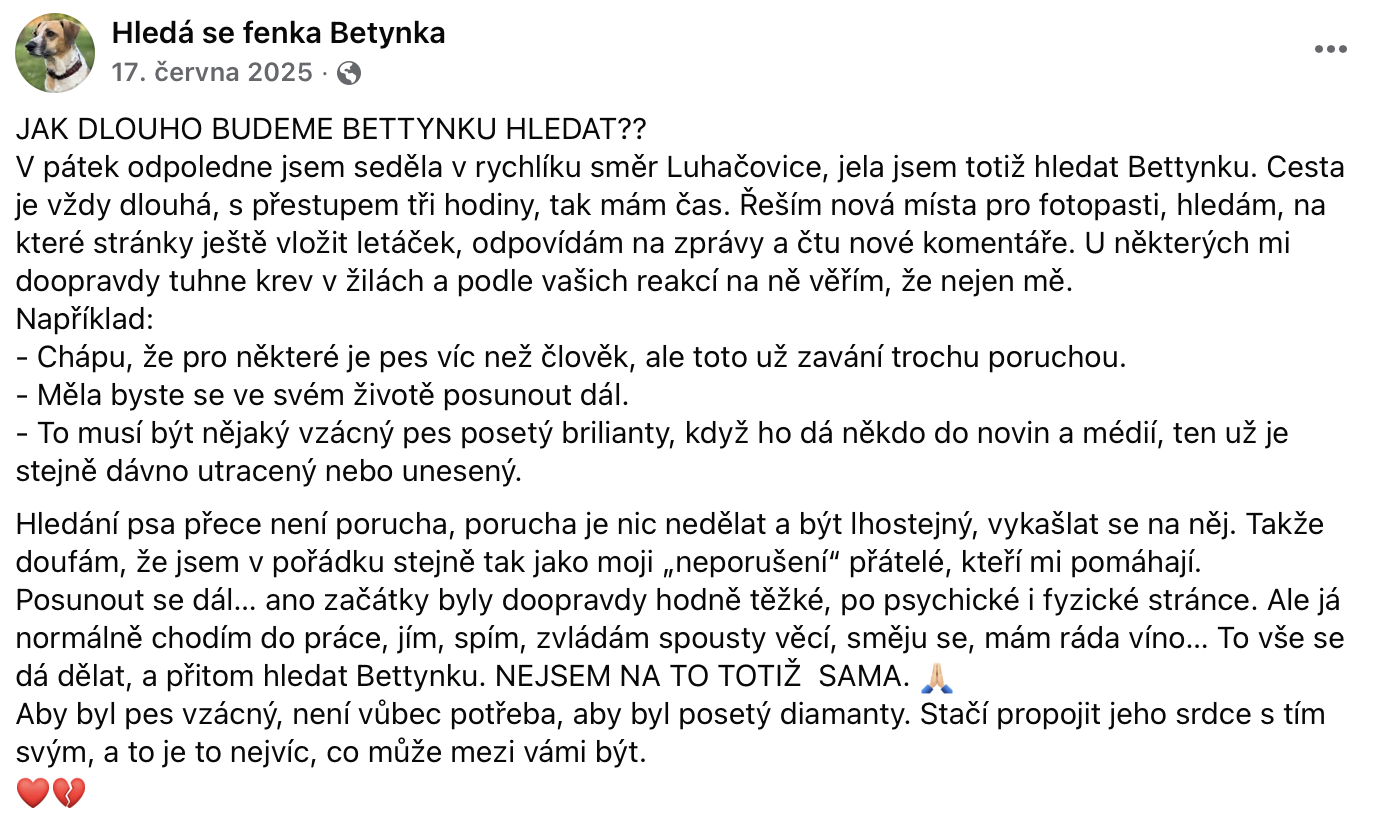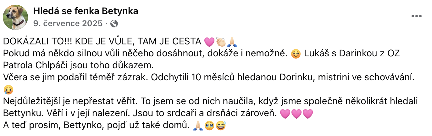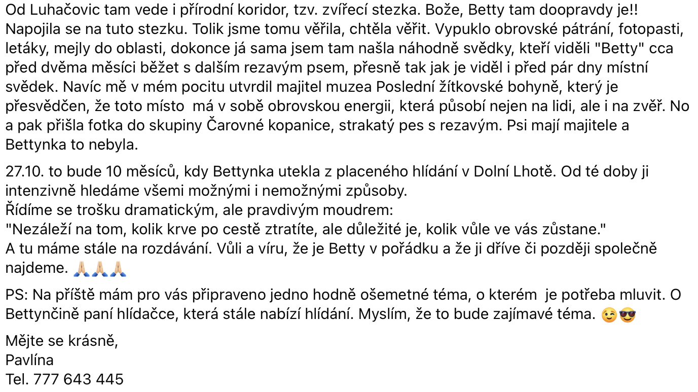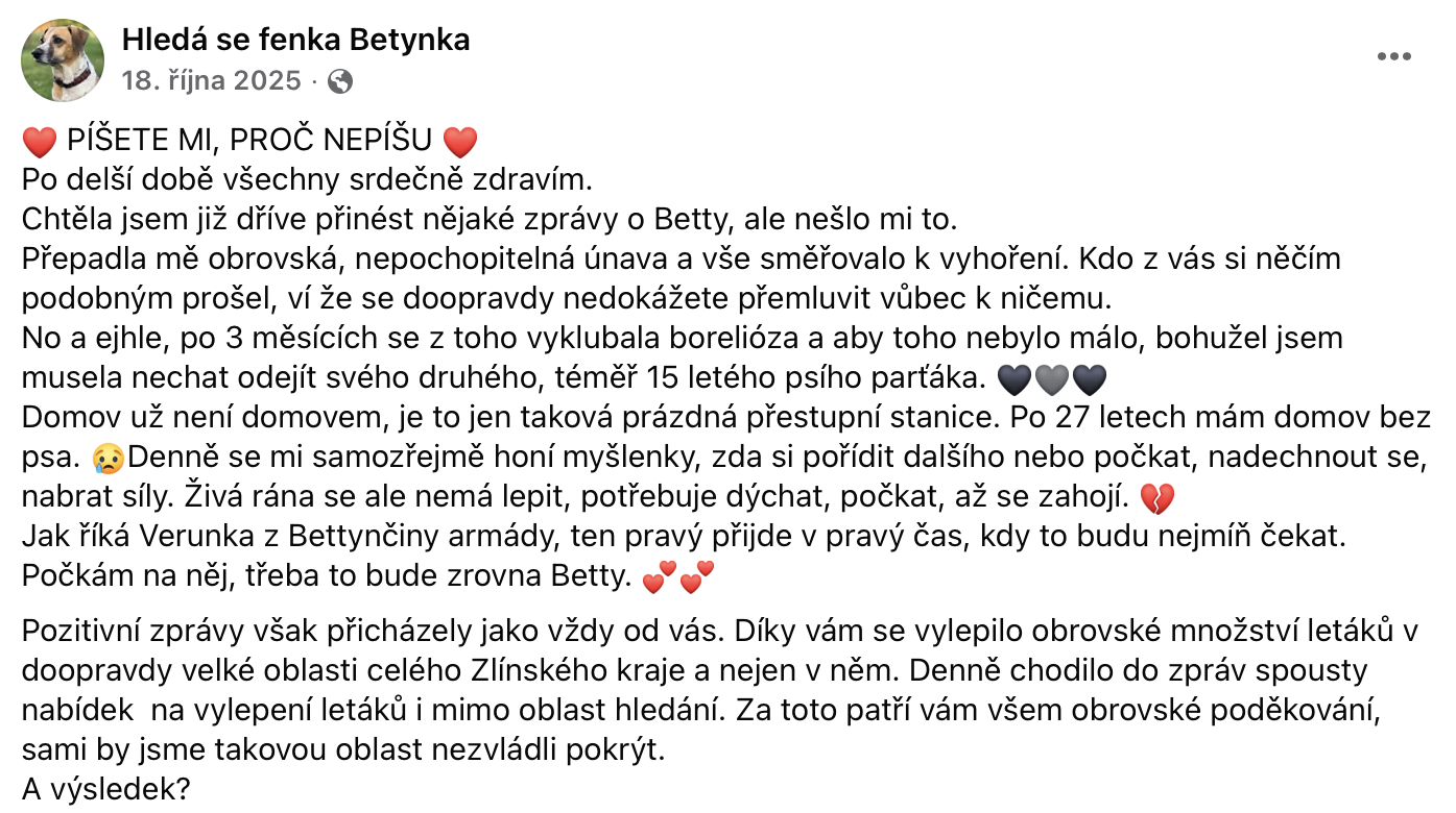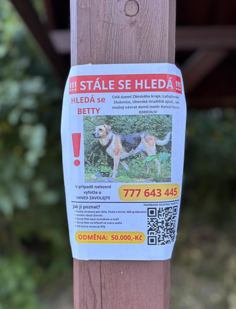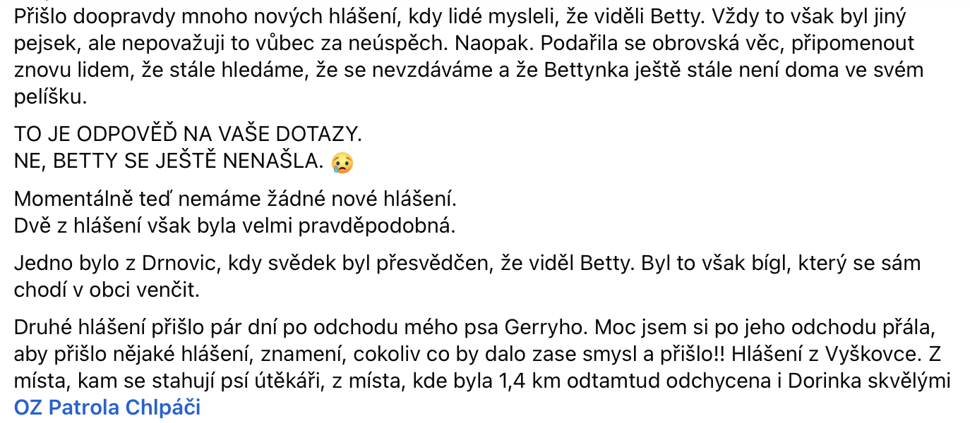 Sledujte nás na facebooku ve skupině Hledá se fenka Betynka.