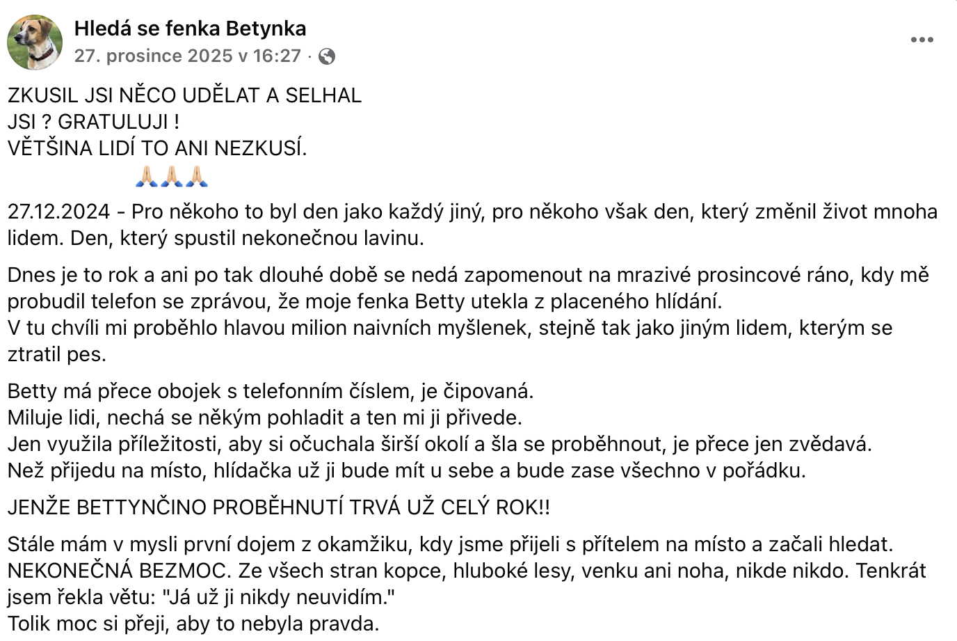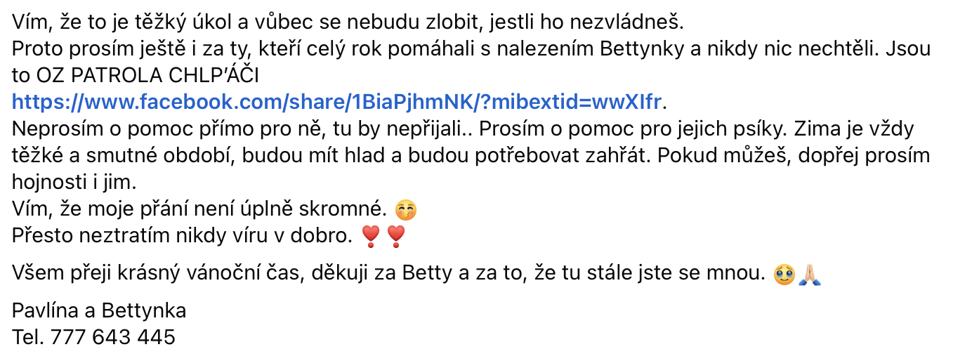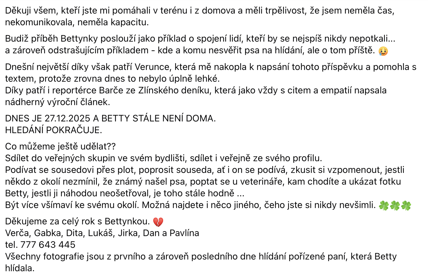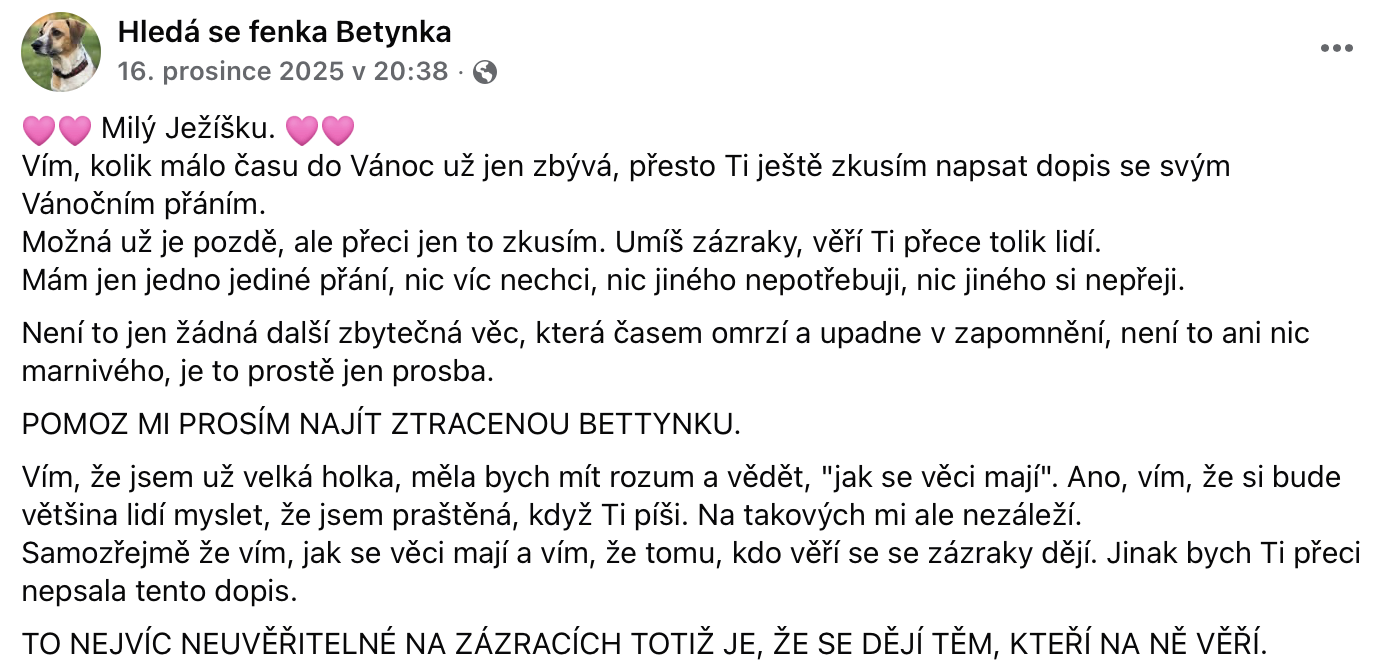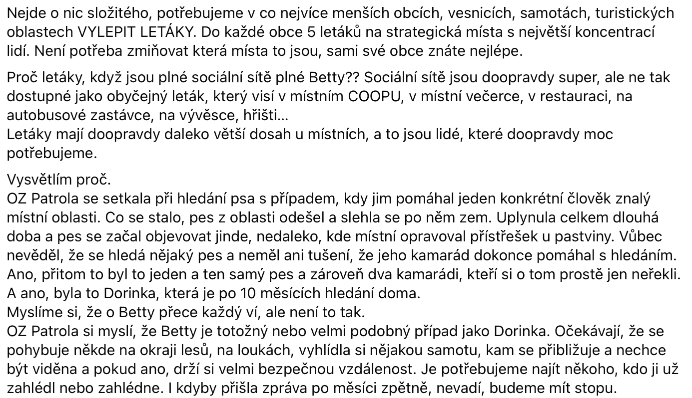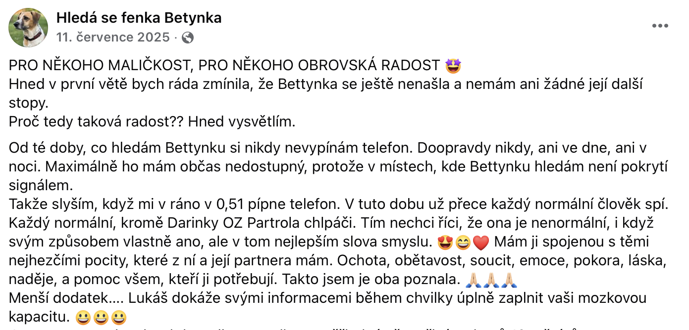 Sledujte nás na facebooku ve skupině Hledá se fenka Betynka.
