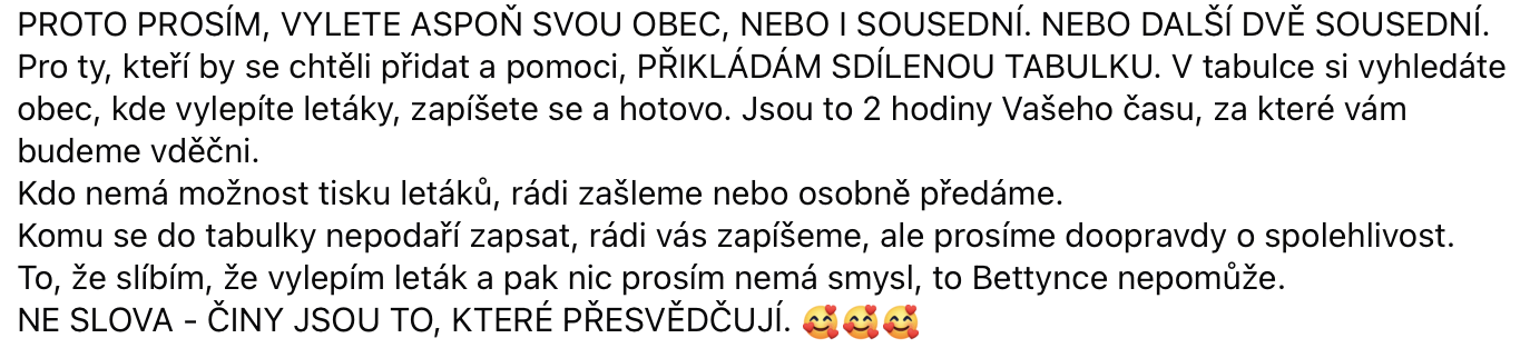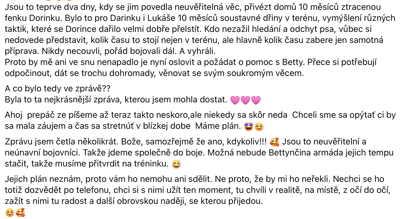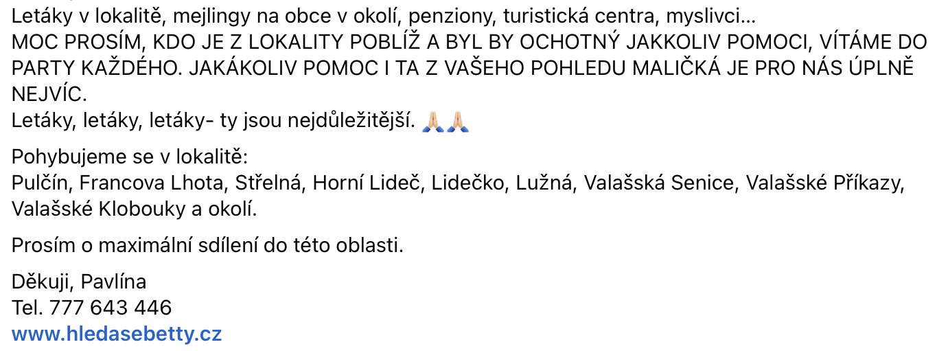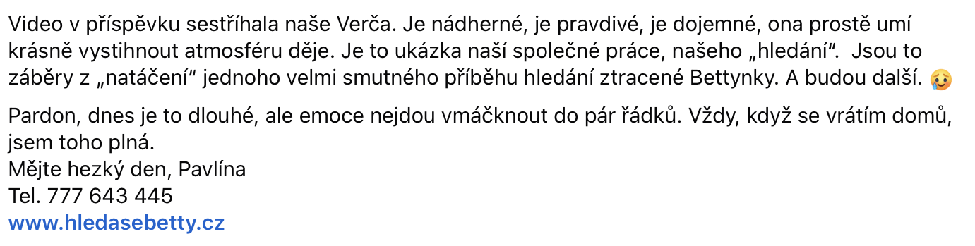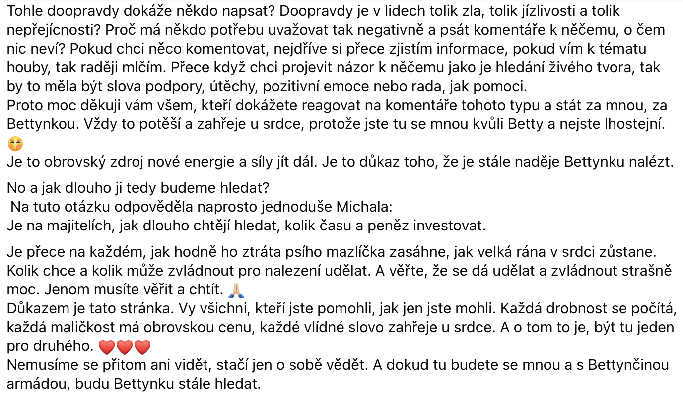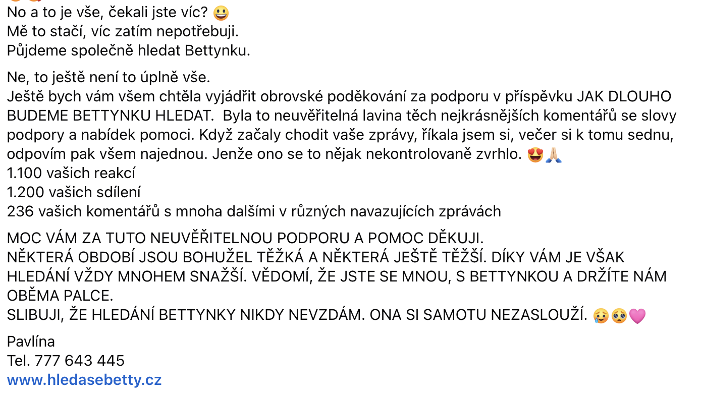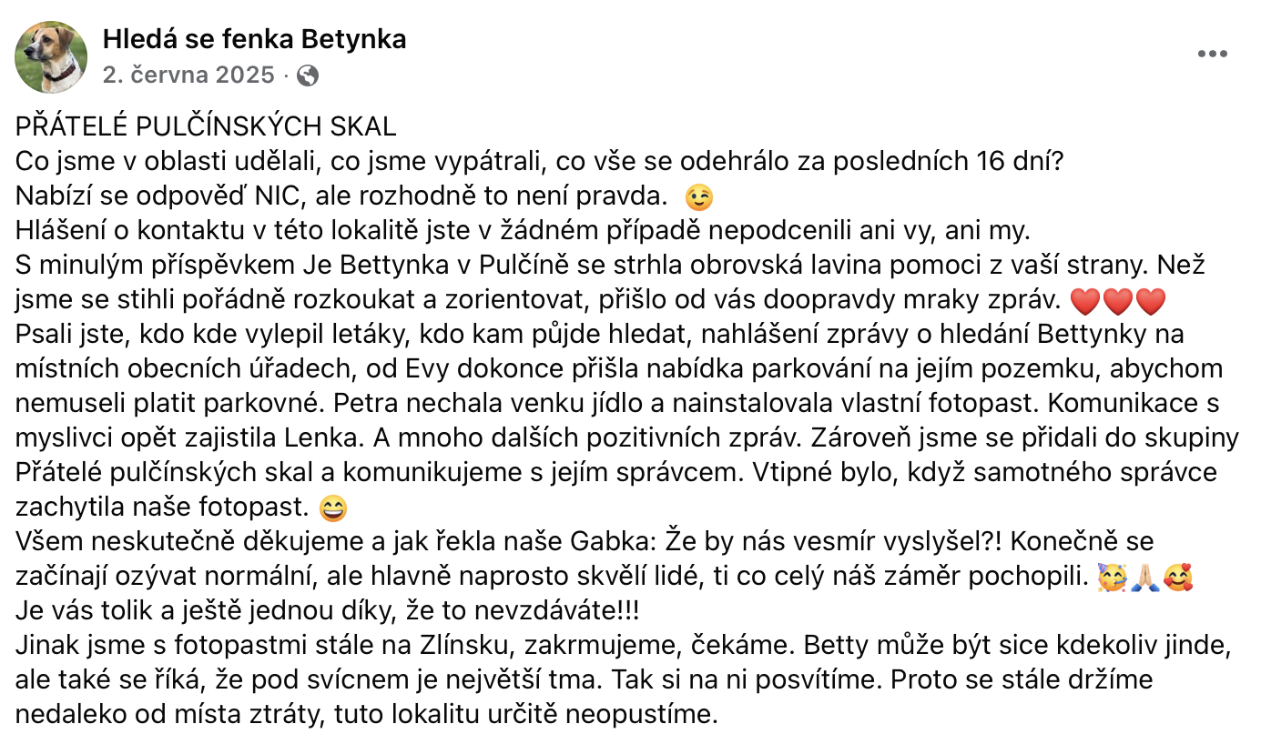Moc ráda bych dnes poděkovala všem lidem, kteří nabídli pomoc a zapůjčili své fotopasti. Předávali je se slzami v očích a přáním, aby už se Bettynka konečně vrátila domů.